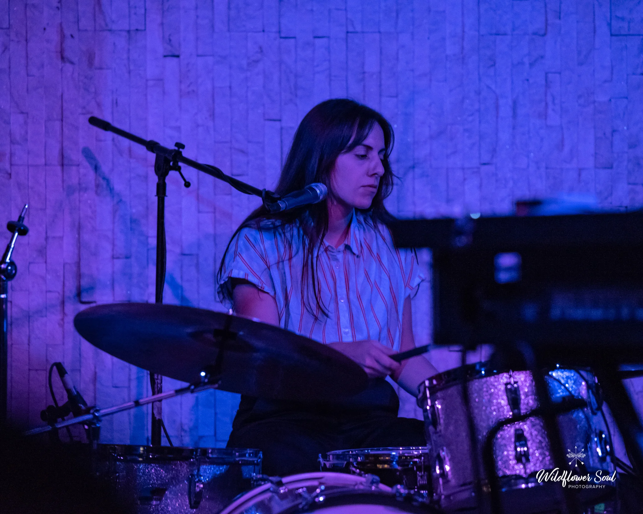 Nestled in downtown Kansas City off of Grand Blvd, recordBar has a max capacity of 400 people, which makes a great space for a more intimate show. Walking in, if you look up, you’ll notice the classic ceiling tiles, reminiscent of older architecture. Above the full-service bar, there is a small balcony. On the main floor, there are a few tables and chairs set up for those who prefer to sit, and a dance floor to allow for those who prefer to dance or be in front of the action of the band on stage.